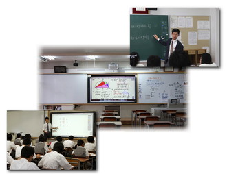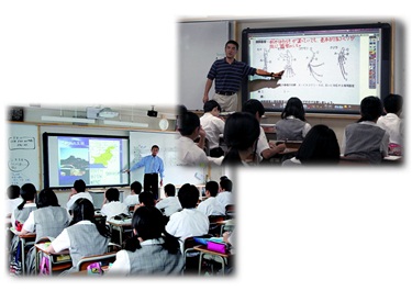 生徒たちに分かりやすいと感じてもらえる授業をもっとしたい ― そうした思いから、本校では、生徒たちの思考力の形成過程を考慮した上、中学の普通教室すべてに電子黒板(IWB)を導入しました。他校に劣らぬ質の高いICT活用の授業実績を持つ本校では、今回さらにIWBを導入したことで、これまで以上に生徒たちの集中力や授業への参加意識を高める効果を生み出すことができています。