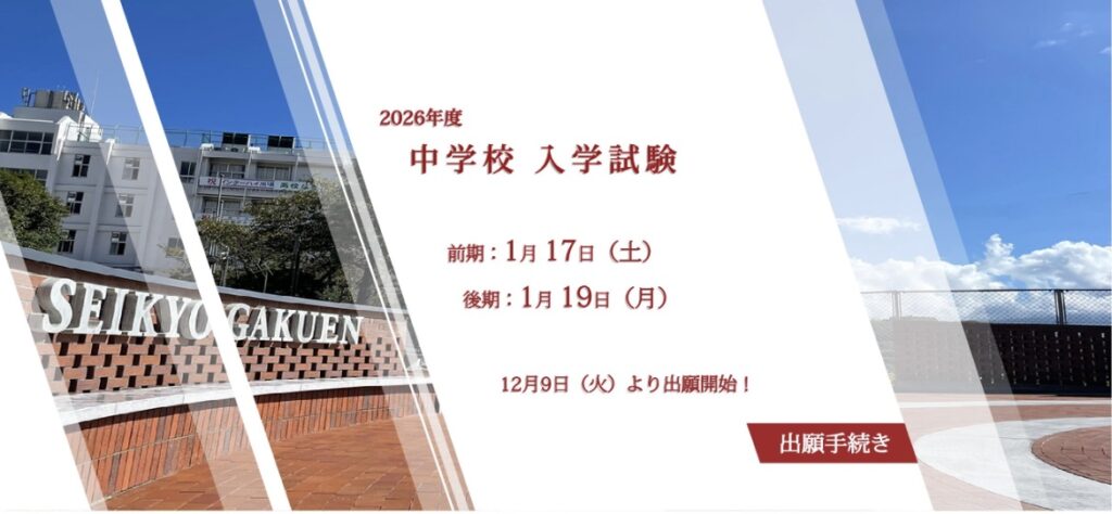 冬季休業のお知らせ2025.12.18冬季休業期間は、12月28日(日)より1月4日(日)まで となります。 1月5日(月)から通常業務を開始しておりますので、1月5日以降にお問い合わせくださるようお願い申し上げます。 現在、中学入試のWEB出願受付中です。 高校入試:WEB出願のマイページ作成ができます。 お知らせ一覧へ