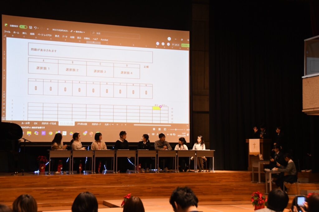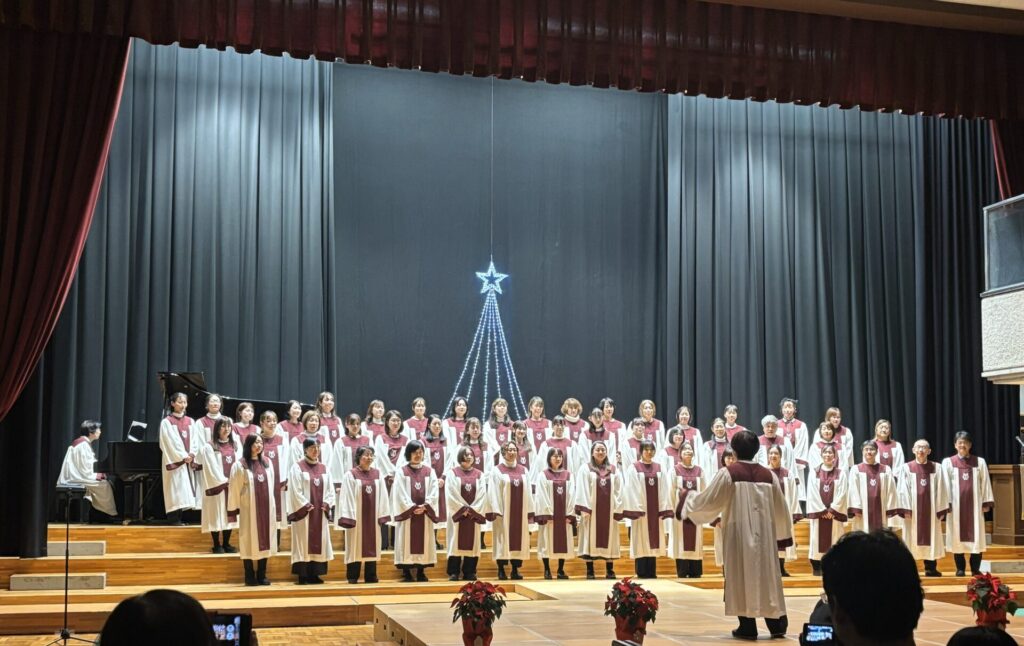 第2部では、ハンドベル部による演奏で美しい音色にクリスマスムードが高まり、クイズ研究会の趣向を凝らしたクリスマスクイズに会場全体が沸きました。締めくくりの合唱部による合唱は、澄んだ歌声がチャペルいっぱいに広がり感動のひとときでした。